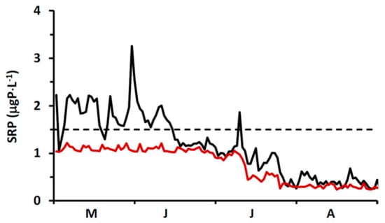Evaluation of model performance for chlorophyll utilized the MECP buoy data described above (Section 4.2.5). Simulation results are those for model nodes immediately adjoining the MECP buoy site. Model-calculated daily mean surface chlorophyll levels for 2016 are compared with daily measurements made at the MECP buoy in Figure 9. The simulation tracks long term trends in chlorophyll levels (spring increase and stable summer conditions), but mutes some of the more short term variability, likely due to the simplistic treatment of phytoplankton biomass (e.g., single functional type, no explicit representation of grazers). Most importantly, the model accurately reflects the magnitude and seasonal trend of the chlorophyll standing crop and thus its role as an SRP sink. The mean May–August surface value measured at the buoy (0.84 µg⋅L−1) is not significantly different than the modeled value (0.88 µg L−1; paired t-test p = 0.3).