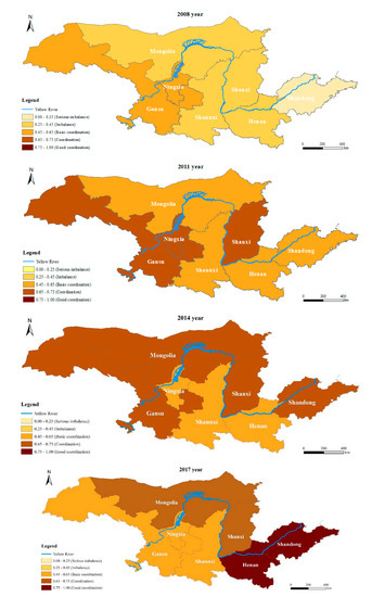 - From 2014 to 2017: During this period, the CCD remained in a relatively stable state, except for the constant improvement of coordination in some areas. Since 2014, the Chinese Government has tried to protect the resource and environment to the best of its ability and adopted a series of resource and environmental protection measures, such as sponge-city construction, sewage treatment plant alterations, and rainwater and sewage diversion, in order to improve the WRCC. To a certain extent, these situations made it possible to ensure the two systems’ coordinated development. It was virtually impossible to synchronize the development of the urbanization and WRCC due to the shortage of water resources in the YRB. This problem resulted in the failure of the two systems to achieve high-quality development and maintain a state of good coordination. After the operation of the south-to-north water diversion project in 2014, Henan and Shandong experienced an improved WRCC. The coordination state of the two provinces was in or close to a good coordination state. Undeniably, the seven provinces’ coordination state was on a different level in 2017; some provinces will need continuous improvements in the future.