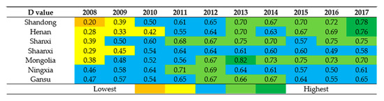 - From 2011 to 2014: The CCD of the seven provinces were in or close to the coordination state. The coordination state of seven provinces remained in the same state from 2011 to 2014, including Shanxi, Shanxi, and Gansu. For example, the other provinces’ coordination state (e.g., Henan and Inner Mongolia) experienced continued improvement from 2011–2013 but declined in 2014. Overall, the connection between the two investigated systems was gradually strengthened, and the coordination state started to be slowly improved.