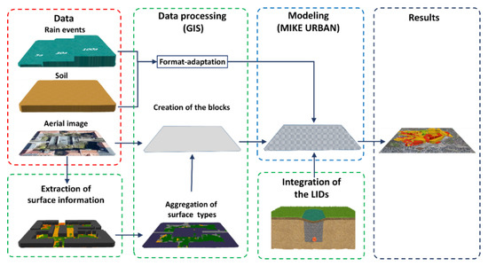 The MUST-B approach uses data on rainfall events, soil hydraulic conductivity, and surface perviousness as an input for the modeling. Yet, the analysis and the simulations are carried out on the urban blocks, instead of the entire urban area. It also assimilates the LIDs in the simulation and estimates the minimum space requirement for the maximum efficiency of the LIDs (Figure 1). The main advantage of the MUST-B approach is that it can be applied on a small scale as well as to a neighborhood, and can also be quickly transferred to large urban areas by aggregating the block modules.