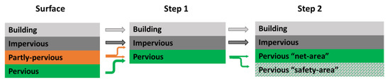 Aggregation of the surface information into the blocks: The four degrees of perviousness were further processed in two consecutive steps and aggregated to the blocks so that each block had attribute information on the pervious and impervious block-surfaces. In the first step, 50% of the partly pervious surface area was assigned to the impervious and 50% to the pervious areas. Then the total pervious area was divided into two categories: (a) the pervious “safety area” along the buildings which is not available for the construction of LIDs and (b) the remaining pervious “net area” which is available for the construction of infiltration LIDs.