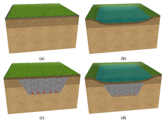 The stormwater run-off simulation for each block was carried out with the software package MIKE URBAN from DHI (MIKE URBAN, Hørsholm, Danmark). The individual LIDs can be integrated in MIKE URBAN as shown in Figure 4. Thereby, the LIDs were adjusted with regard to technology design, dimensioning and materials used according to Figure 3.
