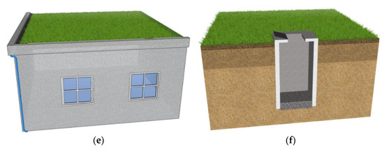 LIDs considered in the scenario development. (a) Surface infiltration. No retention volume. (b) Swale infiltration. Structure height: 0.30 m. (c) Trench infiltration (gravel). Structure height: 1 m. Retention volume: 350 L/m2. (d) Trough-trench infiltration (gravel). Structure height: 1.55 m. Retention volume: 730 L/m2. (e) Extensive roof greening. Structure height: 0.1 m. Retention volume: 50 L/m2. (f) Infiltration shaft. Depth: 2 m. Min. Diameter: 1 m. Retention volume: 300 L/m2.