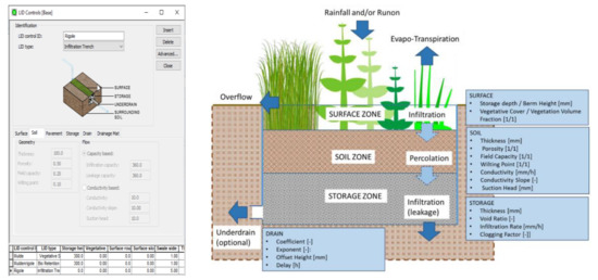 Input interface and conceptual model of a low-impact development (LID) for the illustration of infiltration and retention systems.