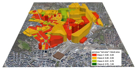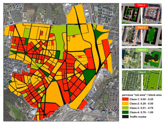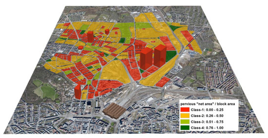 The study area Leipzig-North, which covers 792 ha was divided into 267 urban blocks and the traffic area. The blocks range in size from 0.05 ha to 30 ha and have a total area of 647 ha, while the traffic area covers 145 ha. The blocks were divided into four classes based on the attribute information on the pervious ‘net area’ and the total area (Figure 5). The class-1 with a degree of pervious area ranging from 1% to 25% consists of 122 blocks (46% of the block number) with a total area of 196 ha (30% of the total block area). Class-2 consists of 100 blocks (37% of the block number), which cover 352 ha (54% of the total block area). The class-3 had 14 blocks (5% of the block number) and covered 59 ha (9% of the total block area). The remaining 31 blocks (11% of the block number) covering 40 ha (7% of the total block area) belong to class-4 (see Figure 4). As summarized for the entire area, the impervious surface covered an area of 317 ha (49% of the total block area), the pervious surface covered an area of 330 ha (51% of the block area), while 102 ha of the total pervious area was classified as safety area which is not suitable for construction of infiltration systems, leaving 228 ha (35% of the total block area) suitable for the construction of LIDs.
