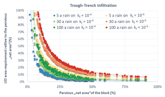 Simulation results for trough-trench infiltration were selected as an example of a LID with retention capacity (Figure 7). For a 30-year rainfall event, the blocks equipped with trough-trench infiltration show a total runoff of 1226 m3 in 2 h for a soil with high permeability (kf = 10−4 m/s). Relative to the stormwater of 320,466 m3, the scenario shows nearly complete retention/infiltration (99.6%) of stormwater with a land requirement of only 6% of the available pervious “net area”. For a soil with low permeability, the total runoff is 3439 m3 (retention/infiltration 98.9%) with a land use of 15.5% of the available area (Figure 7).