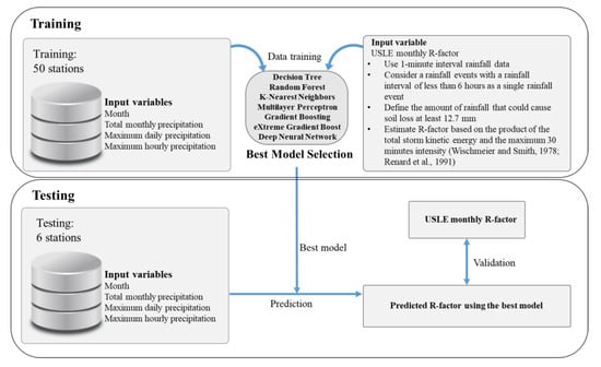 The objective of this study is to develop machine learning models to predict the monthly R-factor values, which are comparable with those calculated by the USLE method. For this aim, we calculated R-factor using 1-min interval rainfall data to estimate the maximum 30-min rainfall intensity of the target values, which is monthly R factor values at 50 stations in S. Korea. In the previous study by Risal et al. [27], the R-factor values for South Korea were calculated using 10-min interval rainfall data, which cannot give an exact estimate of maximum 30-min rainfall intensity. The procedure used in this study is shown in Figure 1.
