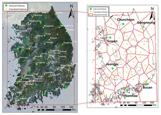 Figure 2 shows the location of weather stations where 1-min rainfall data have been observed over the years in South Korea. The fifty points marked in circles are observational stations that provide data used for training and validation to create machine learning models predicting rainfall erosivity factors, while six stations marked in green on the right map—Chuncheon, Gangneung, Suwon, Jeonju, Busan, and Namhae—represent the stations for the final evaluation of the results predicted by machine learning models selected through validation. Thiessen network presented using red lines of the map on the right shows a range of the weather environment around the weather stations.