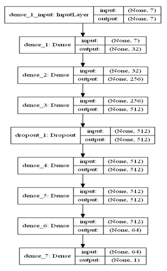 Deep Neural Network (DNN) is a predictive model that uses multiple layers of computational nodes for extracting features of existing data and depending on patterns learn to predict the outcome of some future input data [54]. The invention of the new optimizers enables us to train a large number of hyperparameters more quickly. In addition, the regularization and dropout allow us to avoid overfitting. The package used to build DNN in this study was TensorFlow developed by Google. In this study, the DNN model structure consisted of 7 dense layers and 1 dropout (Figure 3). Additional details about DNN can be found in Hinton et al. [55].