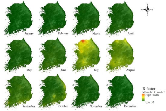 The monthly R-factors for two months from July to August contribute more than 50% of the total average annual R factor value of Korea. The rainfall occurs mainly in the wet season and the likelihood of erosion is very high compared to the dry season. In such a case, using the average annual R-factor value can give a misleading amount of soil erosion. For these reasons, the monthly R-factor would be helpful in analyzing the impact of the rainfall on soil erosion rather than the average annual R-factor.