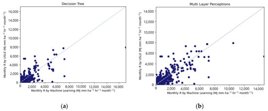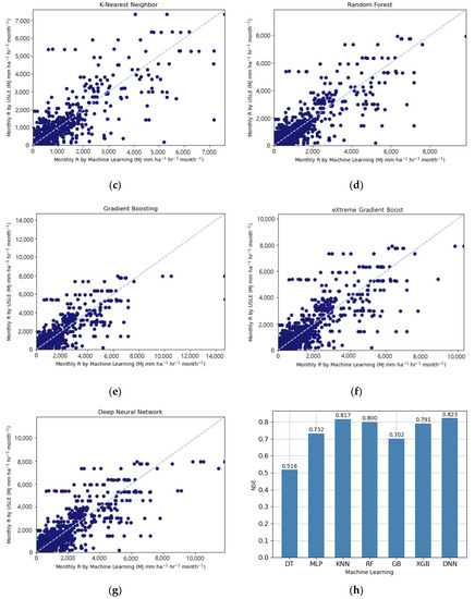 Figure 5 shows the scattering graphs of the R-factors predicted by the seven machine learning models and calculated by the USLE method. All machine learning results represent a rather distracting correlation with less agreement. However, in Figure 5h, the Deep Neural Network algorithms predicted USLE R values calculated using the method suggested by USLE users’ manual with higher accuracy, NSE value of 0.823.