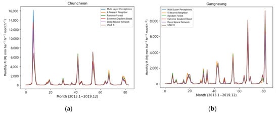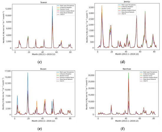 Figure 6 shows the results of the prediction of the five machine learning models (i.e., Multilayer Perceptron, K-Nearest Neighbor, Random Forest, eXtreme Gradient Boost, and Deep Neural Network) at six sites for the testing of the selected models, as well as the time series comparison graph for 2013–2019 of the monthly R-factor values calculated on the USLE basis. At most sites, it showed that the time series trend fits well with a pattern similar to the USLE calculation value. In particular, looking at the distribution in Figure 6b Gangneung, the value of 9303 MJ mm ha−1 h−1 month−1 in October 2019, which represented the peak value of the rainfall erosivity factor, was generally well predicted by all machine learning models. Among the models, the result of the Random Forest model estimated a similar value with 8133 MJ mm ha−1 h−1 month−1.