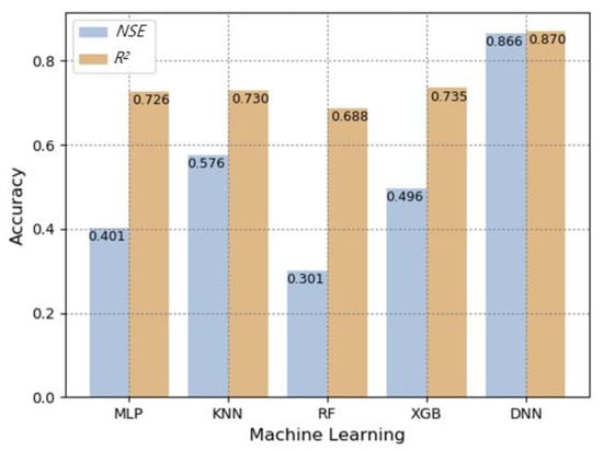 When comparing the results of DNN and the other machine learning models (Decision Tree, Random Forest, K-Nearest Neighbors, Multilayer Perceptron, Gradient Boosting, and eXtreme Gradient Boost), we can see that DNN provided more accurate prediction results over other machine learning algorithms. Moreover, the highest value of NSE, RMSE, MAE, and R2 was found when the DNN was employed for the prediction R-factor values.