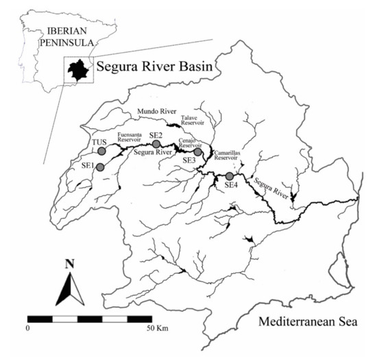 This study was conducted in the upper and middle parts of the Segura River Basin (drainage area of 18,870 km2), a highly regulated river located in the southeast of the Iberian Peninsula (Figure 1). The Segura River Basin is characterised by a typical Mediterranean climate with a pronounced spatial and seasonal hydrological variability. Currently, this basin is highly regulated in terms of irrigation supply and human water demands, which have greatly modified the natural flow regime, resulting in changes in flow magnitude and a reverse seasonal flow pattern in some areas [42,43]. Supplementary Material 1 provides an accurate description about the flow regime characteristics of the sampled streams.