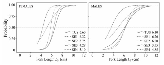 Predicted probability of maturity according to fork length for females and males for the five studied populations (TUS, SE1, SE2, SE3 and SE4) of Gobio lozanoi.
