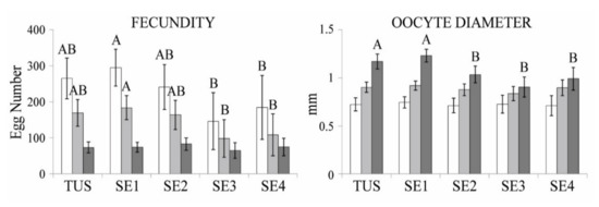 Oocytes larger than 0.25 mm in diameter were considered opaque and all oocytes above 0.55 mm of diameter were vitellogenic. Fecundity data from each sampling site are summarised in Table 3. No significant differences were found in fecundity and oocyte diameters by age (ANCOVA, p > 0.05) and fork length was not significant as a covariable when oocyte diameters were analysed, which indicates no effect of fish size on egg diameters in the studied fish. Significant differences were found in potential (ANCOVA F(1, 4, 39) = 3.27, p = 0.023) and absolute fecundity (ANCOVA F(1, 4, 39) = 2.90, p = 0.037) among sampling sites. SE1 showed the highest number of oocytes and SE3 showed the lowest ones at a given length (Bonferroni post hoc: p = 0.023 and p = 0.037, respectively). Only the diameter of batch fecundity showed significant differences among sampling sites (ANCOVA F(1, 4, 37) = 9.96, p < 0.001). Batch oocyte diameters in TUS and SE1 populations were larger than in SE2, SE3 and SE4 (Bonferroni post hoc: p < 0.001) (Figure 5).