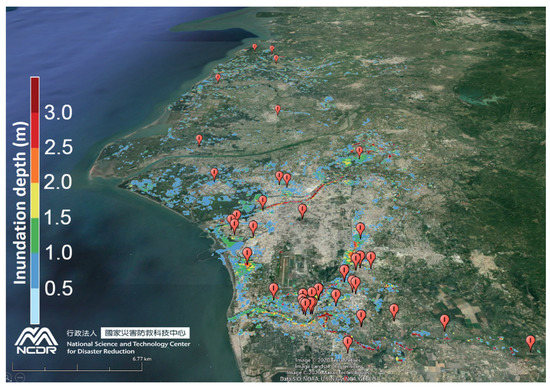 - Chen, W.B.; Liu, W.C. Assessment of storm surge inundation and potential hazard maps for the southern coast of Taiwan. Nat. Hazards 2016, 82, 591–616. [Google Scholar] [CrossRef]