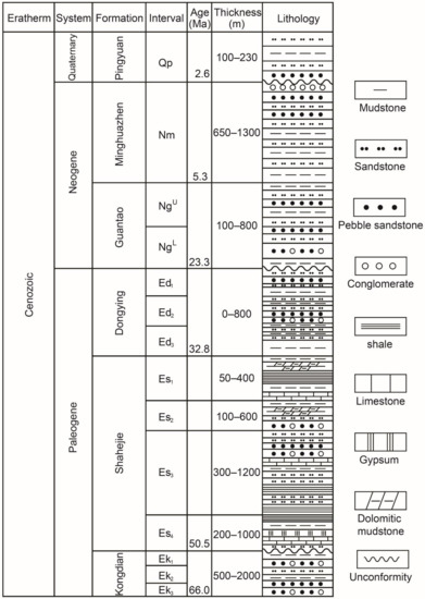 Stratigraphic sequence of the Chezhen depression in the Cenozoic. Modified from Zhang et al. (2019) [2].