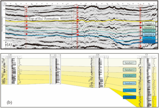 According to the W–E seismic interpretation profile, the deformation of Es3L Formation tends to be gentle in this region, and the fault scarp with a large dip only exists near the eastern boundary (Figure 3a). Combining this with the stratigraphic correlation profile derived from the logging data, the Es3L Formation can be divided into six sandsets (Figure 3b). Because Sandset 6 was only identified in the easternmost well drilling and there were no comparable ones in other wells, we excluded it and performed the analyses focused on the data from Sandsets 1–5 in this region.