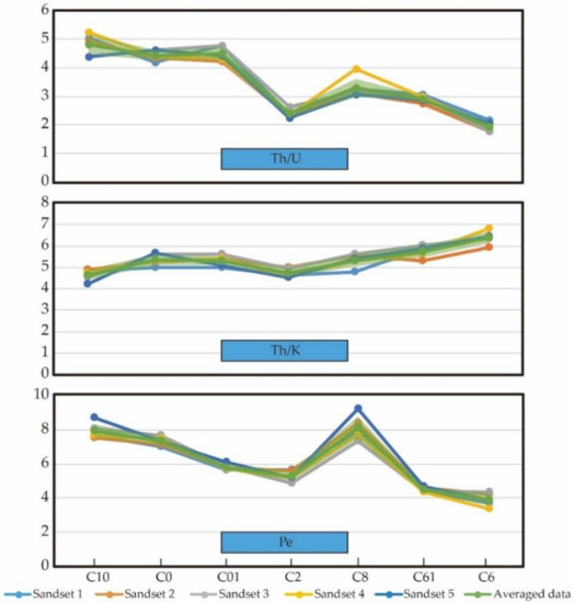 The variation of the averaged Th/U ratio of the five sandsets indicates a decline from Wells C0 and C10 in the north to C6 in the south, and from Well C8 in the west to C2 in the east (Figure 5a). The averaged Th/K ratio indicates an increase from Wells C10 and C0 in the northwest to Well C6 in the south, from Well C8 in the west to Well C6, and from Well C2 in the northeast to Well C6 (Figure 5b). The variation of the averaged Pe index is similar to that of Th/U, which indicates a decline from Wells C10 and C0 in the northeast to Well C6 in the south, from Well C8 in the west to Well C6, and from Well C2 in the northeast to Well C6 (Figure 5c).