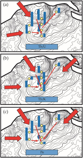 Gamma-ray (GR) logging data are measured from the “total” gamma activity surrounding a borehole. This activity is a sum of radioactive contributions from the decay series of U238 (mainly from the intermediate daughter Bi214) and Th232 (mainly from Tl208), and from K40 [56]. Th mainly exists in heavy/resistate minerals (e.g., thorite, monazite, and rutile) [57] and is generally presumed to be contained by clay minerals in clastic sediments [58,59]. Because Th is mainly transported in a state of solid particles [58,59], the concentration of Th is decreased by hydraulic sorting and recycling of sedimentary environments along the paleocurrents [60]. U is present in uraninite (only in the case of sediments deposited before oxy-atmospheric conversion), allanite, zircon, and monazite in sedimentary rocks; in various rock-forming minerals; and in association with various colloidal and carbonaceous substances in sediments [57]. In the migration of sediments, U may be extracted by chemical weathering, recycling [61], and the pH and Eh of ancient fluvial systems and transport to the reservoirs along paleocurrents [57]. K is contained mainly in K-feldspars and clay minerals. The survival of K-feldspars in a sedimentary environment is a function of the relief and climatic factors that prevailed in the provenance [62]. The process of sedimentary transport from high to low positions decreases the concentration of K in sediments. Because the K-bearing minerals are less stable compared to Th-bearing minerals, K decays faster than Th in a natural sedimentary environment [63]. Additionally, the effective elimination of K-feldspars renders sediments more quartz-rich and mature. Therefore, along the direction of paleocurrents, the Th/U ratio decreases and the Th/K ratio increases.