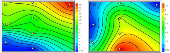 (a) Averaged reservoir thickness contour map. (b) Averaged porosity contour map. The data correspond to Table 3.