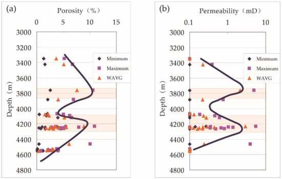 The variations of porosity (a) and permeability (b) with depth, corresponding to Table 4. Thick black lines indicate the fitted variational curves. Red shades indicate the abnormal overpressure zones. WAVG = Weighted-average data.