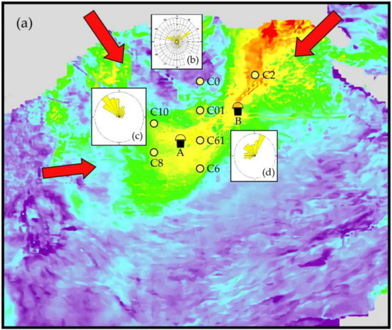 (a) Cumulative seismic amplitude map. Blue to red indicates the velocity of seismic waves from fast to slow. Red arrows indicate the directions of paleocurrents. A and B indicate the predicted high-quality liquid reservoirs (presented as buckets). (b–d) The paleocurrents implied by the results of stratigraphic dip logging of Wells C10, C01, and C61 are presented in rose charts.