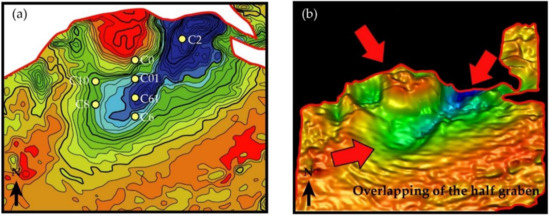 Based on the logging data from all 40 wells (33 of them are hidden following privacy policies) in the Chezhen depression, we restored the paleogeomorphology associated with the deposition of the Es3L Formation in this region (Figure 9). The paleogeomorphologic restoration map shows that the central to northeastern part of the region was the subsidence center of the Chezhen depression with lower altitude, collecting the sediments from the terrains with higher altitude in the northeast, northwest, and west. Although there is an area of middle-high paleoelevation in the southern part of this region, we consider it may be the stratigraphic overlapping of sediments deposited along the southern margin of the half-graben based on our results regarding paleocurrents (Figure 9b).