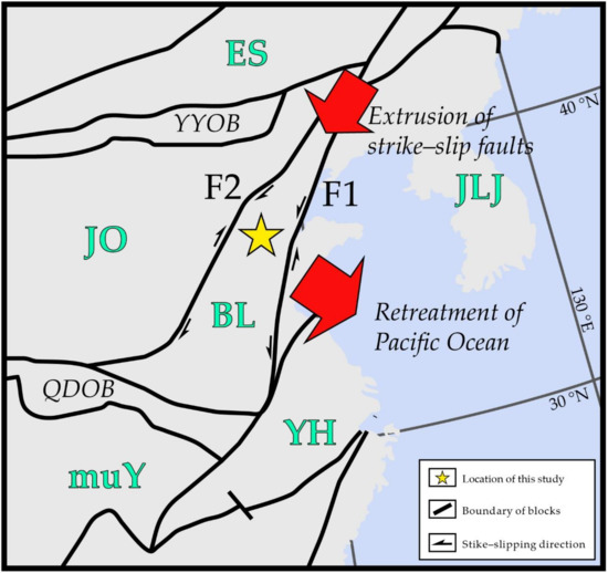 A simplified tectonic map of eastern China. Modified from Li et al. (2010) [89]. BL = Bohai–Luxi block; ES = Erlian–Songliao block; JLJ = Jiaobei–Liaodong–Jinan block; JO = Jinji–Ordos block; muY = middle–upper Yangtze block; YH = lower Yangtze–southern Huanghai block; YYOB = Yinshan–Yanshan orogenic belt; QDOB = Qinling–Dabie orogenic belt; F1 = Tan–Lu strike-slip fault; F2 = Lan–Liao strike-slip fault. Red arrows indicate the directions of tectonic stress.