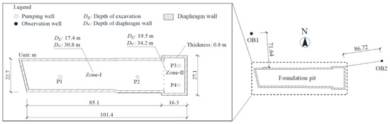 Plan view of foundation pit and layout of pumping and observation wells (recreated based on [42]).
