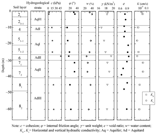 The foundation pit is one major kind of underground structure in the massive construction of underground space [1,2,3,4]. Gradually increased excavation area and depth with the development of urban construction may result in environmental effects. There are high risks during construction in multi-aquifer–aquitard alternative strata which is rich in groundwater [5,6,7,8,9]. To prevent water inrush accidents and ensure the safety of underground construction, groundwater control is essential and dewatering is a kind of common measurement [10,11,12]. However, inappropriate dewatering may result in some negative impacts, such as soil deformation [13,14,15], differential settlement [16,17,18] and sand flow or piping phenomenon [19]. To reduce the negative impacts of dewatering, waterproof curtains such as diaphragm walls [20,21], bored piles [22] and mixing piles [23] are constructed before the excavation. Waterproof curtains play a good role in blocking water seepage and extending the length of seepage distance [24,25], which can reduce the drawdown of groundwater level and ground settlement outside the pit.