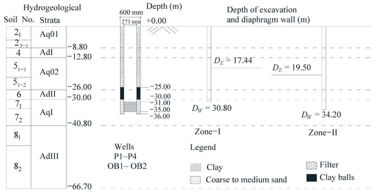 In this case, drawdown of AqII in Zone-I and II should be larger than 3.38m and 7.14m. To ensure the safety of construction and evaluate the dewatering effect on environment, the pumping test was conducted after the construction of the diaphragm wall. The placement of the pumping and observation wells are shown in Figure 1 and the structure and burial depth of the wells are shown in Figure 3. The pumping test contains two steps of dewatering, of which the pumping time and discharge rate is shown in Table 1.