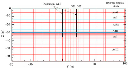 The placement of the diaphragm wall, pumping and observation wells is shown in Figure 5 according to the actual engineering case. Points G11, G12, G21 and G22 were added for further discussion of the simulation results. The initial groundwater level of Aq01, AqI and AqII layer is −0.5 m, −1.0 m and −2.8 m respectively. The groundwater level of four lateral boundaries is set as fixed hydraulic head boundary, which is equal to the initial groundwater level. The bottom boundary is set as the confining boundary.