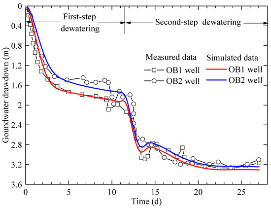 The comparison between measured data and simulated data is shown in Figure 7. As shown in Figure 7, the simulated groundwater drawdown decreases synchronously with the measured data. For the first step of dewatering, groundwater drawdown of observation wells OB1 and OB2 was 1.93 m and 1.74 m respectively, and that for simulated data was about 1.99 m and 1.72 m, of which the deviation is 3.1% and 1.2%. For the second step of dewatering, the final drawdown of wells OB1 and OB2 was 3.23 m and 3.20 m, and the simulated data was 3.30 m and 3.22 m. The deviation of the final drawdown was 2.2% and 0.63% respectively. These results demonstrate that the simulated results fit the measured data reasonably.