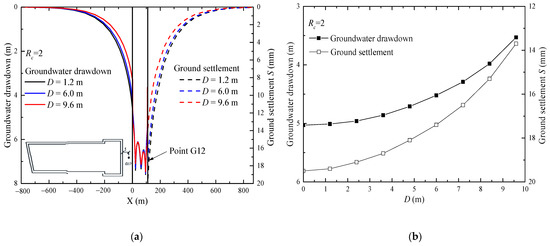 Figure 8a shows the groundwater drawdown and ground settlement with different values of D when RC equals 2. Groundwater drawdown outside the pit is obviously smaller than that inside the pit. The groundwater drawdown and ground settlement after dewatering of point G12, which is 5 m away outside the diaphragm wall is shown in Figure 8b. With the increasing of D, groundwater drawdown at point G12 decreases from 5.03 m (D = 0 m) to 3.53 m (D = 9.6 m). Ground settlement at point G12 decreases from 19.5 mm (D = 0 m) to 13.70 mm (D = 9.6 m). Both groundwater drawdown and ground settlement decrease gently initially and then change quickly.
