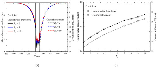 Figure 9a presents the groundwater drawdown and ground settlement with different value of RC when D is 4.8 m. Groundwater drawdown at point G12 is 4.71 m when RC is 2 and 4.25 m when RC is 10. Due to the decrease of vertical hydraulic conductivity, water supply from the boundary is more difficult which results in the decrease of groundwater drawdown and reduction of ground settlement outside the pit. The ground settlement at point G12 is 18.6 mm when RC is 1 and 15.7 mm when RC is 10. Moreover, comparing the change of groundwater drawdown and ground settlement outside the pit under different value of D and RC, the influence of D on the groundwater drawdown outside the pit is much larger than that of RC.