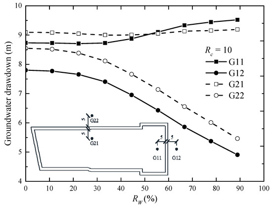 With the increasing of RW, the seepage path lengthens and the blocking effect is more. Therefore, the supply volume from outside to inside the pit decreases, which results in decreased drawdown outside the pit obviously. Due to the drawdown inside the pit being required to stay the same, the drawdown inside the pit (G11 and G21) varies slightly. For example, the drawdown of G11 ranges from 9.52 m (RW = 88.9%) to 8.73 m (RW = 0), and the variation is 0.79 m. Drawdown of G12 ranges from 4.91 m (RW = 88.9%) to 7.80 m (RW = 0), and the variation is 2.89 m. Moreover, the effect of dewatering is dissymmetry in the rectangle foundation pit. The ground drawdown outside the pit along the short side (e.g., G12) is larger than that along the long side (e.g., G22) [46,47].