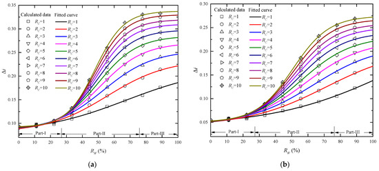 Figure 11 presents the relationship between Δi and RW when RC changes from 1 to 10. All the curves can be fitted by the Boltzmann curve, which is widely used in the simulation of different fields [48,49] and can be divided into three parts: initial gradual part (Part-I), middle sharp part (Part-II) and final gentle part (Part-III). With the increasing of RW, Δi increases gradually, due to the blocking effect of the diaphragm wall on the groundwater seepage being stronger. When D is larger than the filter length of pumping well, drawdown inside the pit changes little while drawdown outside decreases sharply, and this results in the sharp increase of Δi in Part-II. When RW keeps increasing, since the difference of drawdown at two sides of diaphragm wall keeps constant while the seepage distance is much longer, Δi increases gently at the Part-III.
