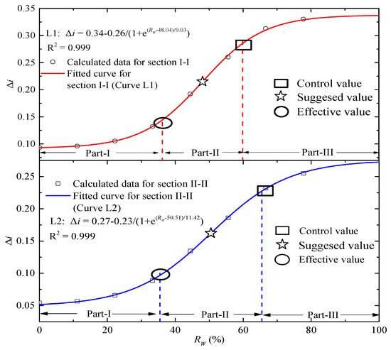 As is shown in Figure 12, the effective, suggested and control value of RW is 36.2%, 48.0% and 59.9% for section I-I, and 35.9%, 50.6% and 65.4% for section II-II, respectively. By a comprehensive consideration of Δi on two sections, the effective, suggested and control value of RW is 37%, 51% and 66% when RC is 10.