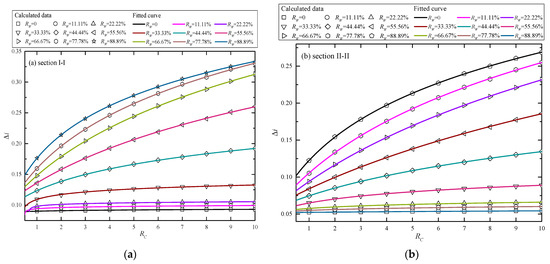 Relationship between Δi and RC when RW changes from 0 to 88.89%: (a) section I-I; (b) section II-II.