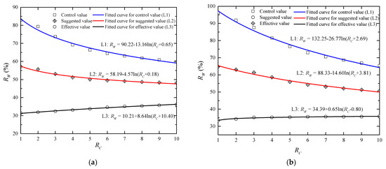 To determine the common relationship between control, suggested and effective RW and RC, all cases are conducted and the relationship is shown in Figure 15. The control and suggested value of RW decreases with the increase of RC, while the effective value of RW increases with the increase of RC. All the relationships between RW and RC can be fitted by the logarithmic function, of which the characteristic is that the curve changes quickly firstly and the acceleration decreases. By the fitted equation, it is convenient to calculate the control, suggested and effective value of RW according to different values of RC.