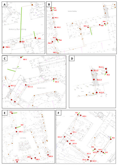 Survey locations for sub sections of the Drainage Survey where: (A) Amory Building, (B) Harrison Building, (C) Innovation 1 and 2, (D) Kay Building, (E) Laver Building and (F) Streatham Court. Red dots indicate manholes surveyed (with associated manhole ID), green lines indicate where a washroom with ULFTs enter a manhole chamber.