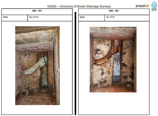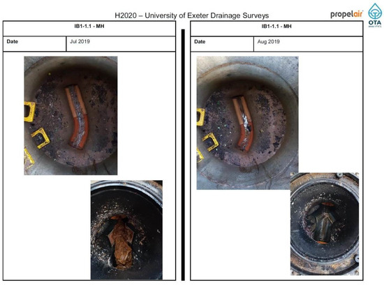 The spatial resolution of the survey was dictated by the physical arrangements of the drainage system. Initially, it was proposed that CCTV data would be obtained up and downstream of each foul manhole. However, this scope was expanded during the study period to assess for potential issues in chambers further downstream of each building. The survey locations for each building—identifying the manhole ID of each inspected manhole—is provided in Figure 1.