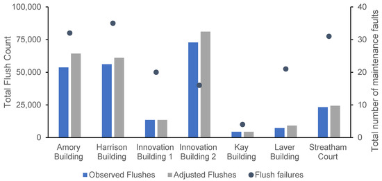 Total observed and adjusted flushes per building during the six-month study. Total number of maintenance issues resulting in a failure to flush shown on the secondary axis.