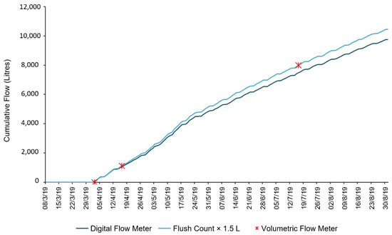 Significant water savings were achieved across the study period. This is supported by theoretical calculations based on ULFT flush count and corresponding flush volume; as well as manual metered readings collected for billing purposes (Figure 5). Firstly, ULFTs were calculated to have been flushed 257,925 times over a six-month period. If we conservatively assume each ULFT flush corresponds to an average of 1.7 L of water consumption then an annual water demand reduction of 2287 m3 can be inferred for this trial location (compared to traditional 6 litre WCs). It is noted that a longer timeseries of water demand data may identify seasonal variations which impact the overall water savings and studies into this element are ongoing.