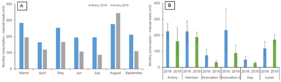 Comparison of estimated monthly consumption based on (A) manual monthly readings the Amory building between March–September 2018 (prior to ULFT installation; blue) and March–September 2019 (during this study; grey); and (B) mean meter readings for the aforementioned periods in 2018 (blue), 2019 (green) for each building.