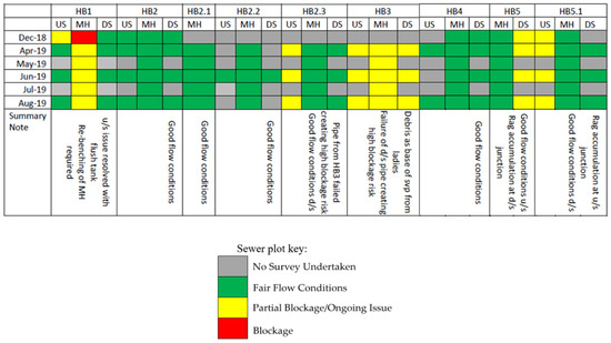 The drainage engineer’s reports were compiled to provide qualitative observations linked to each manhole chamber evaluated in the project. To support consistent observations, every survey was conducted by the same engineering staff and the academic team and Propelair® technicians were able to attend these surveys in an oversight role. In order to visualise the data, a traffic light plot was developed for each chamber (Figure 7).
