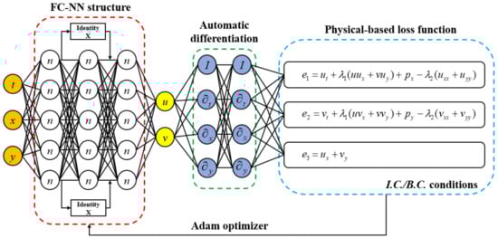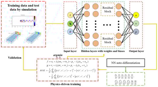 where and are the differential operators of the initial and boundary conditions, respectively. When parameters are determined, the solution of the flow dynamics (i.e., and ) can be obatined numerically by discretizing the Equations (1) and (2) utilizing the finite difference/finite volume/finite element methods. However, this approach needs to generate large numbers of mesh and calculate the nonlinear problems iteratively which itself is time-consuming. In addition, some parameters in the fluid dynamics is difficult to be confirmed. The generation of computational meshes is a challenge when solving for the complex configuration in the numerical simulation.