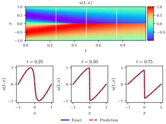 The analytical solution is compared with the solution calculated by the Res-PINN which can be viewed in Figure 6. The top of the Figure 6 is the spatial-temporal values of the Burger’s equation predicted by the analytical solution. The bottom of three figures is comparisons between predicted values (red dotted line) and exact values (blue line) at different times. It is obvious that the predicted values are almost agreement with the exact values. The mean square error of the validation set is to reach to . In addition, the inverse problem of the Burger’s equation is also considered and the parameter predicted by the Res-PINN in Burger’s equation is 0.00318 which is versus with the exact parameter (), the error is almost negligible.